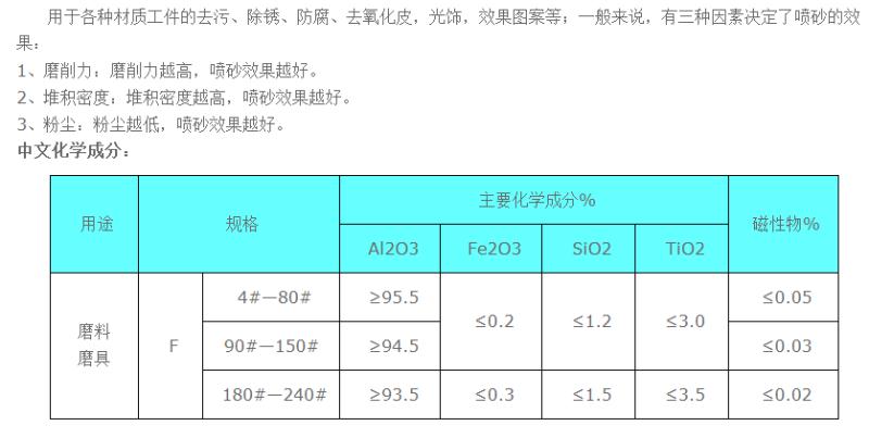棕剛玉噴砂具有拋光時(shí)間短,效率高,效益好,價(jià)格低的特點(diǎn)。該產(chǎn)品硬度適中,韌性高,自銳性好,砂耗低且能回收循環(huán)利用,磨件光潔度好;而且化學(xué)成分穩(wěn)定,耐磨、耐酸堿。棕剛玉噴砂邊角鋒利,可在不斷粉碎分級(jí)中形成新的棱角和邊刃,使其研磨能力優(yōu)于其它磨料。尤其是其具有的硬度高、比重大、化學(xué)性質(zhì)穩(wěn)定及其特有的自銳性等優(yōu)點(diǎn),棕剛玉噴砂同時(shí)更是拋光除銹清理工件,研磨拋光的理想材料。